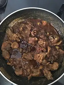 Kongu Nadu cuisine was originally prepared in rural areas. Oputtu, Sandahai and Kola urundai are few among the main dishes. Many dishes in Kongu Nadu are coconut- and onion-based, as the region has an abundant supply of coconut, onions and groundnuts.[4] Thengai paal jaggery, Ulundu Kali, Kachayam, Arisimparupu sadam, Kelvaragu Puttumavu, Arisi Puttumavu, Paniyaram, Kelvaragu Pakoda, Thengai barbi, Kadalai urundai, Ellu urundai and Pori urundai are among other dishes prepared by Tamil people. Most people living in the region usually consume mutton, chicken, freshwater fishes and quail as the region is landlocked. Arisimparupu sadam is a unique dish. Most common oils are sesame and groundnut oil. Coconut oil is used for main cooking and as well as seasoning in certain Kongu Nadu dishes.[5]