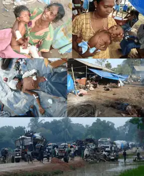 Child victim by indiscriminate shelling, Malnourished baby in camps, Civilian dead bodies and damaged makeshift hospital in No-Fire Zone, Mullivaikkal, 2009, Tamil civilians being displaced in 2008, Injured child by indiscriminate shelling. | |