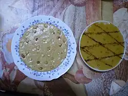 There is another Algerian pastry called tamina (Rfiss), but this one is made with grilled semolina, butter and date paste (gharss).[2] A delicious sweetness to accompany with a good Algerian mint tea or a latte at snack time. Tamina garnished with pine nuts for more delicacy.[3]