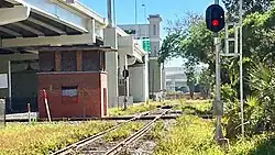 One of the most notable remnants of the Tampa Northern Railroad was TN Tower. TN Tower was an interlocking tower built to govern the crossing of the Tampa Northern Railroad and the Atlantic Coast Line Railroad mainline (now the CSX A Line) at 27°57′34″N 82°25′35″W / 27.959461°N 82.426456°W. The most recent tower was built in 1959 replacing an earlier wooden tower. TN Tower was taken out of service around 1984 after Amtrak Tampa - St. Petersburg service was discontinued and Centralized traffic control signals were installed to protect the crossing. The tower was subsequently abandoned but remained standing until February 2019, when it was demolished. It was the last interlocking tower standing in Florida at the time of its demolition.[9][10] Despite removal, the control point governing the crossing today is still known as "TN", a reference to TN Tower and the Tampa Northern Railroad.