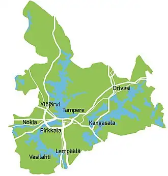 Tampere metropolitan area or Tampere region (Finnish: Tampereen seutu, Swedish: Tammerfors region) is the metropolitan area around the city of Tampere in Finland. The joint municipal authority of the Tampere city region (Finnish: Tampereen kaupunkiseutu, Swedish: Tammerfors stadsregion) consists of eight municipalities: Tampere, Kangasala, Lempäälä, Nokia, Orivesi, Pirkkala, Vesilahti and Ylöjärvi.[2] The Tampere metropolitan area forms a compact, urban-like regional growth centre where people commute from a relatively large area of the Pirkanmaa region.