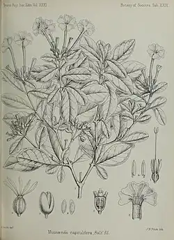 Tamridaea is a genus of flowering plant in the family Rubiaceae. Its only species is Tamridaea capsulifera. It is a shrub endemic to the island of Socotra in Yemen.[2] It is a small shrub with sweet-smelling jasmine-like flowers and emarginate corolla lobes. It drops leaves in summer and produces new leaves after rain, and flowers in winter. Its natural habitat is rocky areas, both limestone and granite, where it often grows in rock crevices from 100 to 1,100 metres elevation.[1]