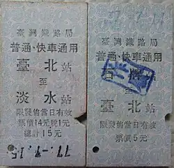 ![]() Edmondson railway ticket issued on the final day of operations on the TRA Tamsui Line. | |