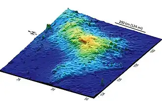 Tamu Massif is a seamount in the northwest Pacific Ocean,[3] sitting atop a triple junction of mid-ocean ridges.[4][1] Tamu Massif is located in the Shatsky Rise about 1,600 km (990 mi) east of Japan. The massif covers an area of about 553,000 square kilometres (214,000 sq mi). Its summit is about 1,980 m (6,500 ft) below the surface of the ocean, and its base extends to about 6.4 km (4.0 mi) deep.[1] It is about 4,460 metres (14,620 ft) tall.