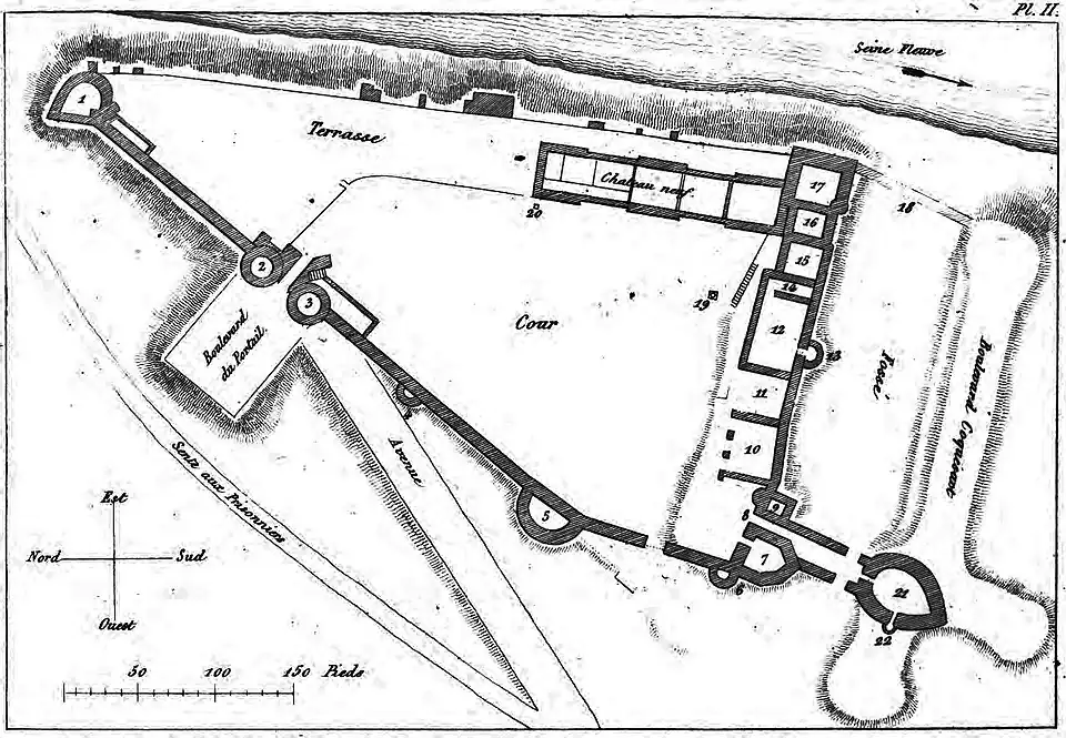 The castle was located on the extremity of a triangular spur, detached from the hillsides of the Seine. A large deep ditch separated it from the plateau. From the ducal epoch remains an enormous motte* with the ruins of a large 15th-century tower (the "Grosse-tour"), possibly some parts of masonry visible in the toothing stones at the south-eastern angle of the tower, and finally an imposing 12th-century residential tower known as the "Tour-carrée" (square tower), which stands at the north-western angle of the enceinte. Looking at the rest of the ensemble, the essential medieval sections are of reconstruction from the end of the 14th and beginning of the 15th centuries. - Jacques Le Maho