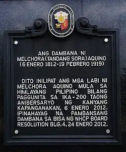 - ^ a b Guiang, Alfred Kristoffer (August 31, 2011). "Transfer of Melchora Aquino's remains to Tandang Sora Shrine gets approval of Historical Commission". Philippine Information Agency. Retrieved November 4, 2018.