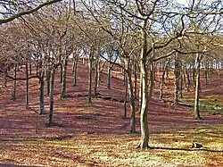 Tandle Hill was originally part of the township of Thornham – part of the extensive parish of Middleton. It was used as a meeting place for radicals in the 19th century. In the period leading up to the Peterloo massacre it was said that it had been used by radicals for practising marching and drilling. The beech woodland was planted to prevent this happening again and the hill became a hunting park and private game reserve as part of the Thornham Estate.[1] It was sold in 1861 and came into the ownership of Joseph Milne, whose wife later sold the park to Norris Bradbury, a Royton councillor. Bradbury gifted the park to the people of Royton in 1919 as a peace offering at the end of the First World War. A granite marker stands near the Oozewood entrance to the park, and its inscription reads: