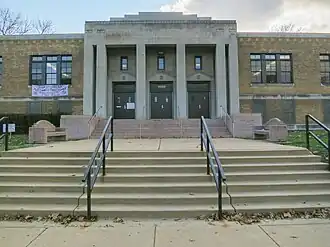 The building was designed by architect Albert A. Osburg and engineer William C. E. Becker.[2] Osburg served as the chief of the Public Improvement Board for the city of St. Louis,[4] and also designed the nearby Homer G. Phillips Hospital.[5] It is an Art Deco-style building has a T-shaped plan with a buff brick exterior, decorative limestone and terracotta details.[2] The interior layout of the building has some Classical Revival design aspects.[2] Most of the stem of the "T" shape is a gymnasium space for sports, with community services at the far south end.[2]
