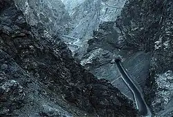 Tang-e Gharu, also known as Tang-e Gharo (Pashto: تنگ غارو), is a gorge and a mountain pass in the Hindu Kush mountain range of Kabul Province, Afghanistan.[1] The Kabul River passes through the gorge, flowing eastward.[2] The Kabul–Jalalabad Road runs through the gorge, parallel to the river.[3] Construction on the road began in the 1940s and was completed in the 1960s,[3][4] replacing the ancient Lataband Pass in the Karkacha hills connecting Kabul and Jalalabad to Pakistan. Both the pass and the road are considered to be of major strategic importance, as they provide Afghanistan a connection to Pakistan and Russia.[5][6] Due to heavy usage during recent conflicts in Afghanistan and frequent traffic accidents, the pass and the surrounding areas have become heavily damaged and periodically closed off.[3][7]