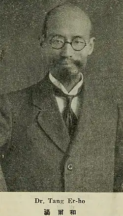 Tang Erho (simplified Chinese: 汤尔和; traditional Chinese: 湯爾和; pinyin: Tāng Ěrhé; Wade-Giles: T'ang Er-ho, 1878 – November 8, 1940) was a medical doctor and politician in the Chinese Beiyang government, later noted for his role as in the collaborationist Provisional Government of the Republic of China.