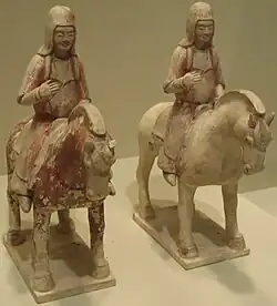 There may be groups of women as dancers or small seated orchestras of musicians, and some sitting figures appear to be beautifying themselves. More rarely, there are female riders and polo players, wearing male dress, which was usual for Tang women when riding, and apparently a fashion in the capital on other occasions.[46] The period was one of unusual freedom for wealthy women in China, and the figures reflect this.[47]