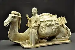 Along with guardian figures and officials, statues of horses are the main type of tomb figure that is also known in other media, such as gilt-bronze or stone, and some rich tombs also contain such figures in metal.[57] The camels may sometimes belong to tombs of people rich from trade,[58] but also seem to have been associated with wealth generally. They are often shown with heads raised and their mouths open, and in the finest models the shaggy areas at the neck and top of the legs are carefully textured in the clay. The horses are the "heavenly horses" from Ferghana in the west, which under the Tang dynasty were more common in China and ceased to be a highly prized rarity.[59] These were also made in pottery under the Han dynasty; the Tang examples are more realistic,[60] if perhaps less expressive.