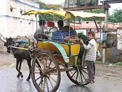 A tanga is a two-wheeled cart drawn by a single horse. It is used for transportation in the Indian subcontinent. There is a canopy over the body, one seat faces forward for the driver and one passenger, and one seat faces the rear for a second passenger.[1][2] Some space is available for baggage below the carriage, between the wheels. This space is often used to carry hay for the horses.