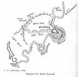 Otapawa pā was held by Tangahoe, Pakakohi and Ngāti Ruanui when it was attacked on 16 January 1866, during the Second Taranaki War. The account of the attack in 'The adventures of Kimble Bent' put Māori losses at 7,[3] but others estimated 30 killed and 30 wounded. The Imperial troops lost 11 dead and 10 wounded. A bulldozer has destroyed most of the site.[4]