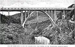 Tangahoe Valley Rd crosses the river on a 24.2 m (79 ft) through arch bridge which replaced one destroyed by floods in 1937, the new bridge being 2.4 m (7.9 ft) above the highest recorded flood level.[24] The road was surveyed in 1898,[25] money had been spent by 1900[26] and the road needed repair after floods in 1903,[27] when £500 was voted for a bridge.[28] A bridge was built in 1920[29] and the road gradually extended up the valley, with money still being voted in 1924.[30]