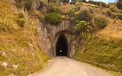 In 1986 part of the roof collapsed in an earthquake and the tunnel was closed. A deep and unstable cutting alongside, which proved to be often unpassable, served for traffic until, in 1996, South Taranaki District Council decided to reopen the tunnel,[22] which re-opened in 1997,[21] at a cost of $245,000.[23]