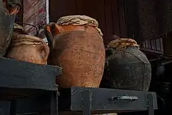 It is prepared with lamb shank or any other meat of choice, one or more preserved lemons, fresh whole cumin, garlic, and saffron melted in water and two tablespoons of olive oil. All the ingredients are put in an amphora that is covered with sealed parchment paper, placed in the embers or the oven and slow cooked for hours.[2]