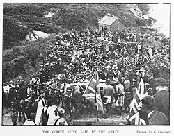 On the last night, the pō whakamutunga ('night of ending'), the mourners hold a vigil and at a time assigned by custom (sometimes midnight, sometimes sunrise) the coffin is closed, before a church or marae funeral service or graveside interment ceremony, invariably Christian in modern times. As with the area the tūpāpaku lies, it is traditional for mourners to wash their hands in water and sprinkle some on their heads before leaving the cemetery. After the burial rites are completed, a feast (hākari) is traditionally served. Mourners are expected to provide koha ('gifts', typically money) towards the meal. After the burial, the home of the deceased and the place where the deceased died are ritually cleansed with karakia (prayers or incantations) and desanctified with food and drink, in a ceremony called takahi whare, 'tramping the house'.[6] That night, the pō whakangahau ('night of entertainment') is a night of relaxation and rest. The widow or widower is not left alone for several nights following.