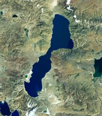 Tangra Yumco (Tibetan: དྭངས་རྭ་གཡུ་མཚོ, Wylie: dwangs rwa g.yu mtsho, Chinese: 当惹雍错; pinyin: dāng rě yōng cuò) is a salt lake in Tibet, China. It is in the southwest of Nyima County. Tangra Yumco is 835.8 square kilometres (322.7 sq mi), with a drainage area of 8,219.7 square kilometres (3,173.6 sq mi), an elevation of 4,528 metres (14,856 ft), length 71.7 kilometres (44.6 mi) and mean width 11.65 kilometres (7.24 mi) (maximum width 19.4 metres [64 ft]).[1] It is the holy lake of the Bön believers.