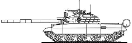 North Korea also received and built T62M tanks [26] (Ob'yekt 166M) which is an extensive modernization of the T-62 with protection and mobility improvements and the "Volna" fire control system. It is fitted with a BDD appliqué armour package, an additional belly armour plate for anti-mine protection, 10 mm thick reinforced rubber side skirts and 10 mm thick anti-neutron liner. The BDD appliqué armour package was specially designed to defeat shaped charges (for example RPGs) and consists of an appliqué plate on the glacis and two horseshoe shaped blocks fitted to the front of the turret. The handrails around the turret have been removed to make space for the bra appliqué armour. Fastenings for four spare track chain links have been added on the side of the turret. The tank is fitted with RhKM tracks from the T-72 main battle tank and two additional shock absorbers on the first pair of roadwheels. The "Volna" fire control system was improved by fitting the KTD-2 (or KTD-1) laser rangefinder in an armoured box over the main armament. There is a new TShSM-41U gunner's sight, new commander's sight, "Meteor-M1" stabiliser, BV-62 ballistic computer and 9K116-2 "Sheksna" (NATO: AT-10 Stabber) guided missile unit with 1K13-BOM sight (it is both a night sight and ATGM launcher sight. However, it cannot be used for both functions simultaneously) which allows the tank to fire 9M117 Bastion ATGMs through its gun tube.[15] The tank was fitted with a gun thermal sleeve, new radios, the R-173 radio set instead of R-123M and a new V-55U diesel engine developing 620 hp (462 kW). The ammunition load was increased by two rounds. Some are fitted with two clusters of four smoke grenade launchers each on the right rear of the turret. The US intelligence saw T-62M main battle tanks for the first time during the Soviet war in Afghanistan and they gave it the designation T-62E.[8][9][27] There are a number of sub-variants of the T-62M, depending on how much of the modernization package the vehicle has installed.