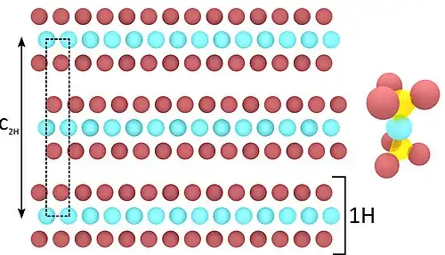 In the 2H phase the single trilayers are stacked one opposed to others, as shown in the relative image. Through molecular beam epitaxy it is possible to grow one single trilayer of 2H-TaSe2, also known as 1H phase. Basically, the 2H phase can be seen as the stacking of 1H phase with opposed relative orientation with respect to each others.[5]