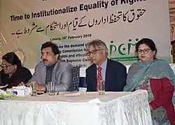 She spoke out against child marriage,[18] corporal punishment,[19] child trafficking in the Gulf States, child abuse,[20] custodial torture,[21] death penalty,[22] religious extremism, gender-based violence[23] and has been pushing for an autonomous commission on children's rights,[24] which was established in Pakistan in April 2020. She advocates for mainstreaming women's rights,[25] effective women's political participation,[26] equal rights of women and men,[27] and endorses international women's day.[28][29] While a member of the NCSW she was involved in panel discussions on religious minority rights,[30][31] policy dialogues on pro-women laws and policies, and reports and research studies on women's rights.[32]
