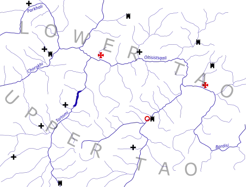 After the Battle of Manzikert in 1071 the Seljuk advance forced the Byzantines to evacuate the eastern Anatolia, in 1072-1073 the Georgian governor of theme of Iberia, Gregory Pakourianos ceded control over Tao to King George II of Georgia. Over the next five centuries, Tao was an integral part of the Kingdom of Georgia. The medieval House of Panaskerteli, who derived their name from the castle of Panaskerti came into prominence with Zakaria of Panaskerti, who together with some other nobles, put down in 1192 the revolt against Queen Tamar of Georgia and were eventually enfeoffed with the duchy of Tao. His descendant, T'aqa Panaskerteli, Duke of Tao, defeated the Turkomans invading Georgia in about 1302 at Tortomi Castle.[4] Tao was later placed within principality of Samtskhe, ruled by the House of Jaqeli.