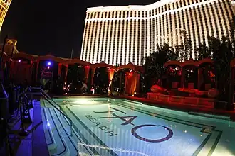 Tao Beach is a dayclub located on the roof of the Venetian hotel, directly above and connected to Tao's restaurant and nightclub. Tao Beach is widely considered to be one of the two first true "dayclubs" in the context of its modern form of the venue category alongside Bare Pool Lounge at The Mirage,[28] and was the first in Las Vegas to operate daily throughout its season. The original version of Tao Beach lasted from 2007 to 2020, when it was moved to a new part of the Venetian and renovated into a much larger venue, reopening in 2022.[29] This first version of Tao Beach became known for being the location of where LMFAO filmed the music video for their 2009 single "Shots".[14]