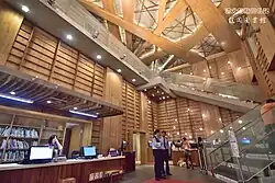 Longgang branch was designed by CTLU Architect & Associates. On the outside, the library looks like a bookshelf, and it has a large number of wooden elements and wooden tables and chairs.[1][2]