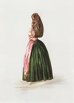 The saya was a large and long silk skirt, colored blue, brown, green or black. To secure it, a belt was used that girded it to the woman's waist. It was not uncommon for some of the less graceful to wear false hips that exaggerated their natural endowments. Underneath this skirt it could see the small foot (shod with an embroidered satin shoe) that also made the colonial Lima women famous. The cloak was also made of silk, tied at the waist and up the back to cover the head and face, revealing only one eye and perhaps the arms. This cloak was usually a simple fabric so that the tapadas would not stand out in public and retain anonymity.[1]