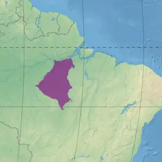 The Tapajós–Xingu moist forests lie between the Tapajós river to the west and the Xingu rivers to the east, tributaries of the Amazon River to the north. They have an area of 336,698.45 square kilometres (130,000.00 sq mi). The rivers act as barriers to the movement of plants, animals and insects to and from adjacent regions. In the south the rugged Serra do Cachimbo divides the ecoregion from other moist forest areas.[1] There are urban centers at Santarém at the mouth of the Tapajós, Aveiro on the lower Tapajós and Altamira on the Iriri River. The ecoregion is crossed the BR-009 and BR-600 highways and by the Rio Novo and Amazônia National Parks.[2]