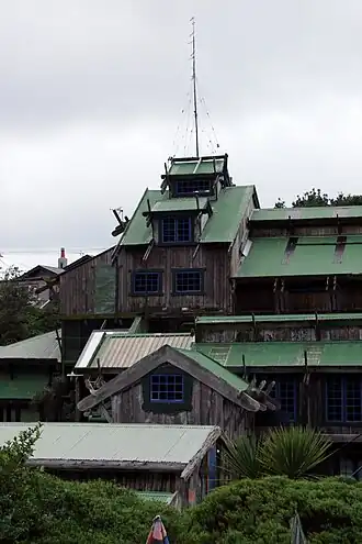 The main building was built into a hillside, which was levelled by hand into seven sections using only pick and shovels.[3] Its frame was constructed in segments using wooden cases used to transport vehicles from Japan.[4] It also featured recycled timbers such as doors and stained-glass windows salvaged from demolition contracts.[4][2]