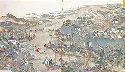 In the intercalary month of July, Taqibu, together with Luo Zenan and Li Xubin, advanced into Gaoqiao and confronted the 20,000 Taiping defenders. Taqibu took the lead in the attack, followed by the rest of the soldiers. It was raining heavily, so the Taiping army's cannons could not be set ablaze, and the Qing army broke thirteen Taiping army camps, annihilating and dispersing thousands of Taiping troops.[6] The navy cooperated with the land attack to fight the enemy, the Taiping army was defeated and the Qing army chased them for more than two hundred miles, destroying the already defeated army in Yangloudong and Chongyang, recovering Xianning.[6] Zeng Guobin arrived at Jinkouhe and ordered Luo Zenan to attack the Huayuan and Taqibu to attack Hongshan. In August, the Taiping army lost Wuchang and Taqibu set up ambushes according to the terrain to attack the Taiping army, which was driven to the lakeside and drowned up to 8,000 or 9,000 people, Wuchang and Hankou were recovered by the Qing court at the same time and captured Daye.[7]
