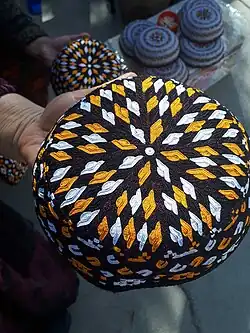 In Arab states of the Persian Gulf, with the exception of Oman, the taqiyah is commonly worn under a ghutra.[7] In Turkmenistan, taqiyahs are called tahýa in the Turkmen language and are a Turkmen national headdress with embroidered national patterns.[8] In the fashion industry, taqiyah caps have become a component in orientalist fashion shows.[9]