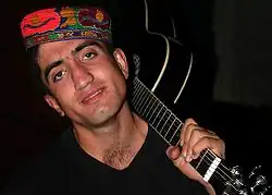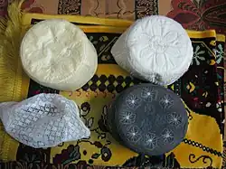 The Taqiyah (Arabic: طاقية, ALA-LC: ṭāqīyah[note 1]), also known as tagiyah or araqchin (Persian: عرقچین; Turkish: takke), is a short, rounded skullcap worn by Muslim men.[1] In the United States and the United Kingdom, it is also referred to as a "kufi",[2][3][4][5] although the Kufi typically has more of an African connotation while the taqiyah has a more universal connotation. Aside from being an adornment, the taqiyah has deeply ingrained significance in Islamic culture, reflecting the wearer's faith, devotion, and sometimes regional identity. While the taqiyah is deeply rooted in Muslim traditions, its use varies based on cultural context rather than strict religious guidelines.[6]
