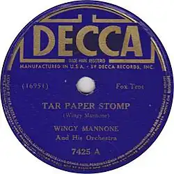 Wingy Manone recorded "Tar Paper Stomp", also known as "Wingy's Stomp" or "Wingy's Blues", on August 28, 1930, in Richmond, Indiana. It was released on September 19, 1930, as a 78 rpm single on Champion Records (16153) credited to Barbeque Joe and his Hot Dogs.[1] The A side was "Tin Roof Blues". It was re-released in 1935 credited to Wingy Mannone's Orchestra (40005).[2] Decca Records acquired Champion Records in 1935. The recording was re-released in 1937 as a Decca 78 rpm single credited to Wingy Mannone & His Orchestra.