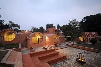 The Austrian-style brick structure was built as a hostel for artists and scientist in 1970s. Nepal started permitting foreign visitors in 1950s. The hostel was built to reflect the "Nepaliness" to the visitors. The land in which the hostel stands was acquired by His Majesty's Government in 1969. The land was transferred to the Nepal Women's Association. In 1970, Angur Baba Joshi, a prominent Nepalese scholar met Austrian architect Carl Pruscha, who served as a UN and UNESCO consultant to the Nepalese government. She then commissioned him to design the hostel. Joshi wanted to create a cultural village for artists in Nepal.[3] The construction began in 1974 and the entire complex was inaugurated on the 25 September 1974, in the presence of Queen Aishwarya Rajya Lakshmi Devi Shah. The style of the structure is a combination of Nepalese and Pruscha's European modernist architecture.[4]