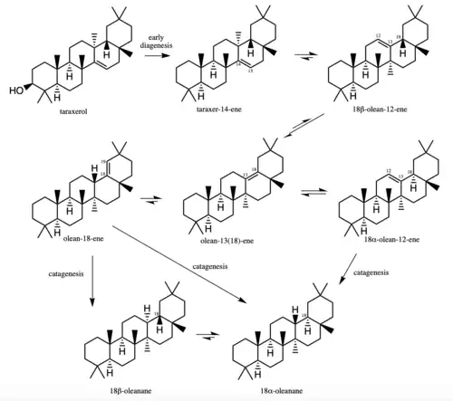 During early diagenesis, taraxerol loses its hydroxyl group and gets transformed to taraxer-14-ene. Taraxer-14-ene can undergo rapid isomerization to form 18β-olean-12-ene, in which the double bond can migrate and form a mixture of olean-12-ene, olean-13(18)-ene, and olean-18-ene. The oleanene isomers form rapidly from taraxerol rearrangements during diagenesis even under cool geothermal conditions.[6] Further reduction during catagenesis of the three compounds gives predominantly 18α-oleanane and its counterpart 18β-oleanane as a minor product. The direct reduction product of taraxerol, taraxerane, is hardly present in natural sediments. Oleanane seems to be the dominant product as a result of the transformation process.[7]