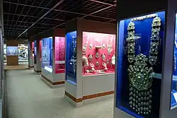 The jewellery collection includes thousands of individual pieces, reflecting a wide range of styles, materials, and techniques. Some notable examples include a Turkoman 'asyk' from Afghanistan or Iran, and a 'hunkun' or 'hirz' necklace from the Sultanate of Oman, adorned with gold decorations and Empress Maria Theresa thalers.[14][31] Enamelled silver jewellery belonging to the last Amirs of Bukhara (circa 1885–1920) are also on display.[25]