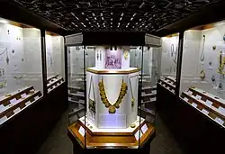 Since the 1980s, the "Gold Room" at the Tareq Rajab Museum has showcased the Rajab family's collection of gold jewellery.[17] This display includes gold jewellery from pre-Islamic Arabia, the medieval period, Mughal India, the Indian subcontinent, Tibet, and Nepal. The collection features several significant items, such as a Fatimid gold bracelet, a head ornament once owned by the Mughal Emperor Humayun, a necklace belonging to Princess Salme of Zanzibar and Oman, and a necklace of the Living Goddess.[17]