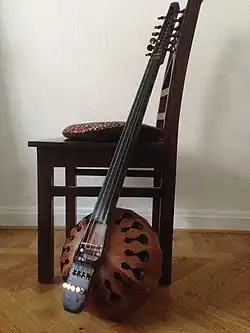 In more recent years, Iranian luthier Mazdak Fereydooni[8] has also begun work on the tarhu at the Labyrinth Musical Workshop on Crete, and has been producing a number of different models under the supervision of Ross Daly. In 2014, musicians Michalis Cholevas and Ross Daly collaborated with Fereydooni to make a new version of the long-neck Tarhu, shorter than the original one made by Peter Biffin by 1/5. The shorter neck enables faster phrasing and easier balancing.[9]