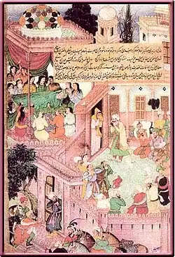 Tarikh e Khandan e Timuriyah also known as "Chronicle of the Descendants of Timur" is a 16th-century manuscript commissioned by Mughal Emperor Akbar in 1577–1578.[1] It describes the descendants of the 14th-century leader Timur in Iran and India[2] This volume was crafted for the emperor's personal use, thus securing a place in his personal library. This volume, inscribed on the finest paper, boasts a collection of 133 paintings, collaboratively crafted by 51 prominent artists like Daswant, Miskin, Madho Mukund, Haidar Kashmiri, Miskeen, Manohar and Basawan.[3] These intricately detailed and refined paintings have been described as exemplifying the pinnacle of Mughal artistic expression.[4] The written text has calligraphy that matches the standards set by the artwork.