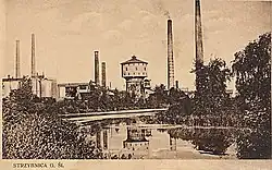 At the onset of World War II in September 1939, Poland was invaded by Germany and Nazi German occupation began. On September 6–8, 1939, the Einsatzgruppe II entered the town to commit various crimes against Poles.[15] Mass searches of Polish organizations, offices and houses,[16] and mass arrests of priests, teachers, intelligentsia and fighters of three anti-German, Silesian Uprisings (1919–1921) took place. The synagogue was burned while German minority enthusiastically welcomed invading Nazi forces. Already by September 1939, the Germans had murdered over 20 Poles in the present-day districts of Lasowice, Strzybnica and Repty Śląskie.[17] Among the victims were miners, former insurgents and a school principal from nearby Chorzów.[17] Germany established and operated a prison for Poles in the town.[18] During the occupation, the Armia Krajowa (Home Army, the leading Polish underground resistance organization) undertook a sabotage campaign against Nazi forces, railroad-transport and local industry. The Germans operated two forced labour subcamps of the Stalag VIII-B/344 prisoner-of-war camp in the town.[19] Liberation of Silesia came in early 1945; in order to save the industrial infrastructure of the region, the Red Army opened an offensive supported by massive numbers of troops with minimal use of heavy artillery and air-bombardment. According to witnesses, the entire operation was extremely fast; countless, shoulder-to-shoulder, crowds of Russian soldiers passed through the town in matter of minutes followed by almost complete still.
