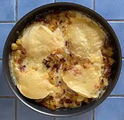 Tartiflette (French pronunciation: [taʁtiflɛt]) is a dish from Savoy in the French Alps.[1] It is made with potatoes, reblochon cheese, lardons and onions.[2][3] A splash of white wine can be added too.[4]