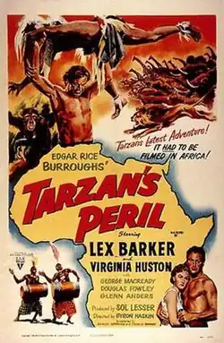 Tarzan's Peril is a 1951 film directed by Byron Haskin and starring Lex Barker as Tarzan and Virginia Huston as Jane, and featuring Dorothy Dandridge as "Melmendi, Queen of the Ashuba."[2][3] The fifteenth film of the Tarzan film series that began with 1932's Tarzan the Ape Man, some of it was shot in Kenya, making it the first Tarzan film to be filmed in Africa, though the majority of its location shooting was done in the United States. Critics praised the convincing integration of the African and American footage. The film is frequently shown under the alternative titles Jungle Queen and Tarzan and the Jungle Queen, and was followed by Tarzan's Savage Fury in 1952.
