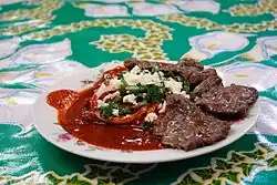 In Mexican cuisine, tasajo is a cut of beef, typically from the states of Oaxaca and Chiapas. It is similar to pork jerky and is often made with organ meat including that of the head and back, but also can be made with flank[2] or skirt steak.