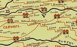 The Peutinger table is a medieval parchment, a repeatedly updated copy of an ancient document, which depicts the main routes of the Roman Empire and the milestones on the way from one city to another. On the route from Avaricum (Bourges) to Casaroduno (for Caesarodunum, Tours), which in all likelihood follows the Cher valley from Foëcy, the consonance of the names and the distances mentioned, despite discrepancies in interpretation that may be due to errors made by the copyists of the Peutinger table,[14] allows us to equate the Tasciaca station with Thésée, while the station to the right on the same route, labeled Gabris, most probably refers to Gièvres and/or Chabris.[15]