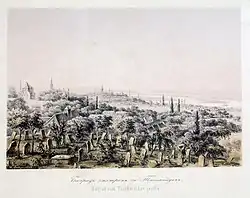 After the successful Second Serbian Uprising when Serbian prince Miloš Obrenović ordered the building of a new town around the old Kalemegdan fortress (Savamala neighborhood), he also ordered that the old Serbian cemetery from Varoš Kapija (near Zeleni Venac)[23] be moved to Tašmajdan, which was done in 1828.[13] New cemetery was intended as "international" contrary to the existing practice, so beside Serbs, it was also the burial place for Hungarians, Germans, Greeks, Italians and French.[24]
