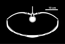 The total number of cervical (neck) vertebrae in Tatenectes is unknown.[2] The neural spines of these vertebrae are short and angled posteriorly.[4] Many features of the cervical vertebrae can be used to identify this genus: the cervical centra (vertebral bodies) are considerably shorter (in length) than wide, and are not constricted in the middle; the articulations for the cervical ribs are short but pronounced; the articular faces of the cervical vertebrae are round and weakly defined; the subcentral foramina (two small openings on the underside of the centrum) of the cervical vertebrae are positioned further apart than typical in related plesiosaurs.[2] The form of the torso in Tatenectes is very distinctive. Flattened and spheroid in shape, the torso has a somewhat boxy cross-section.[5] There are sixteen dorsal (back) vertebrae in Tatenectes, which, when articulated, form a considerably flatter arch than seen in related taxa. The dorsal neural spines are inclined anteriorly. The dorsal ribs articulate with the vertebrae horizontally and are deflected backwards, contributing to the flatness of the body. The gastralia (belly ribs) Tatenectes are unusually large for its size that exhibit pachyostosis (thickening).[8] The medial (midline) gastralia are relatively straight, while the lateral (outer) gastralia are strongly J-shaped. Tatenectes bears four sacral (hip) vertebrae, which are smaller than the dorsal vertebrae. The centra of the caudal (tail) vertebrae are anteroposteriorly short.[5] All of the vertebrae have amphicoelous centra (bearing concave articular faces).[1]