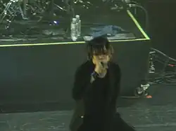 Tatsuro described his voice as "atypical", which makes it stand out and easy to recognize.[5] Although he has taken vocal lessons in the past, he stopped as he did not understand the "abstract" things the instructor would say. "The best teacher I have now is my experience in the field. With trials and errors I have come to understand the fundamentals of singing such as breathing, posture, placement of voice, endurance and so on."[5] When an interviewer suggested a singer must be thinking about the lyrics while performing, Tatsuro dismissed the notion and stated that singing was like riding a bicycle.[7] He also said that he prefers to sing, and does not like screaming because it is tiring.[41] Like the other members of Mucc, Tatsuro often performs barefoot.[42] He said he got the idea after seeing Cocco's April 20, 2001 performance on Music Station, where the barefooted singer abruptly left the studio after finishing her song.[41] He further explained that this was in Mucc's indie days when they had no money; whenever they were putting together new costumes, the shoes were typically the most expensive part, but as a visual kei band they could not simply wear sneakers.[41] Nightmare vocalist Yomi said that he performed barefoot when he was an indie artist due to Tatsuro's influence.[41]